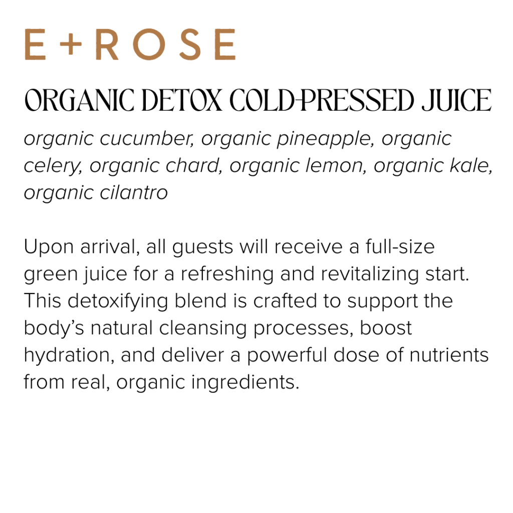 Upon arrival, guests will receive an E+ROSE Organic Detox Cold-Pressed Green Juice to hydrate and energize from within. We’ll then begin together with a grounding guided meditation to soften tension, relax the body, and center the mind—setting the tone for a deeply restorative experience.