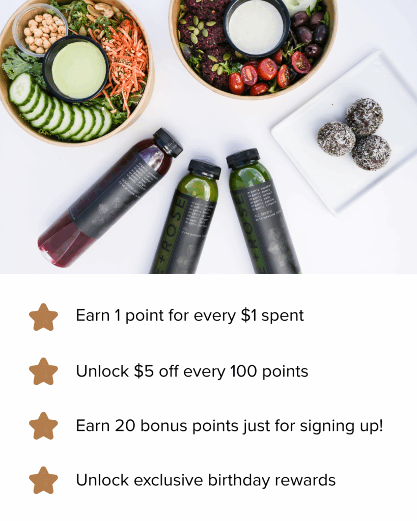 Sip. Earn. Repeat. The E+ROSE Loyalty Program rewards you for nourishing your body with real food and superfood smoothies. Earn points on every purchase, enjoy exclusive member perks, and redeem rewards at all E+ROSE café locations.